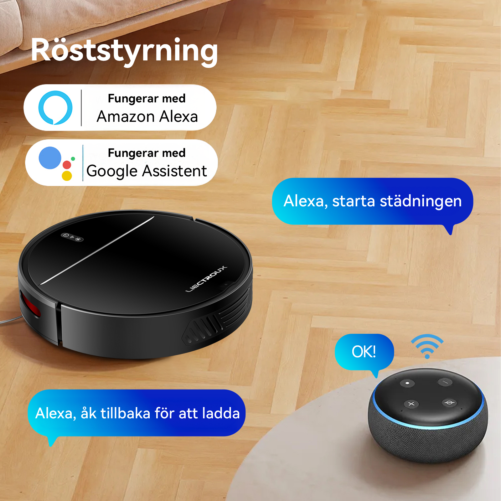 AI-röstintegration – Stöder röstkommandon, så att du kan starta rengöringen med bara ett ord.